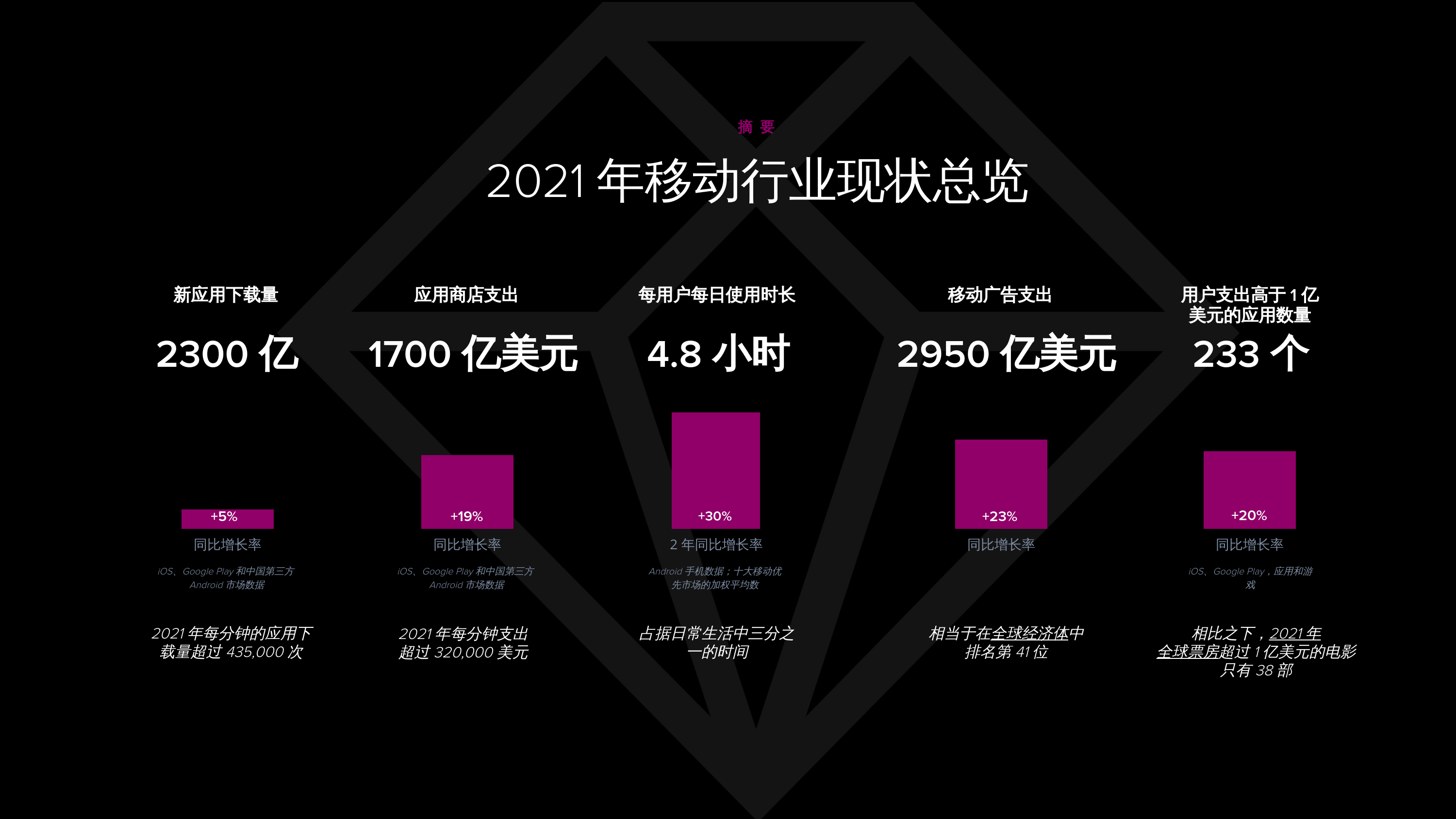 近日,全球领先的移动数据和分析公司App Annie发布了《2022年移动市场报告》。报告总结了2021年全球移动领域的突破性转变,全球应用下载量、应用商店用户支出、广告支出等多个指标保持了良好增幅。其中每用户日均使用时长为4.8小时,与 2019 年相比上升30%;尽管IDFA 新政于2021年上半年落地,全球移动广告支出在2021年依然保持快速增长态势,达到2950亿美元,同比增长了23%。App Annie表示,移动领域已成为吸引消费者的主要渠道——在数字支出中占据 70%,伴随 2022 年北京冬奥会和美国中期选举的到来,数字广告支出将实现强劲增长,预计到2022年,移动广告支出将增长至3500亿美元。